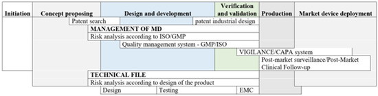 In the fifth stage—“Production”—it is necessary to check the status of all activities carried out so far. The risk plan should be verified in terms of time, dFMEA, and aFMEA updates. Design verification reports and design verification reports are essential. A review of the accompanying regulatory dossier, the acceptance of the accompanying record, and the application for the CE marking should also be carried out. At the end of this phase, it is verified that the product meets customer requirements, regulators, and IPR and is ready to be marketed.
