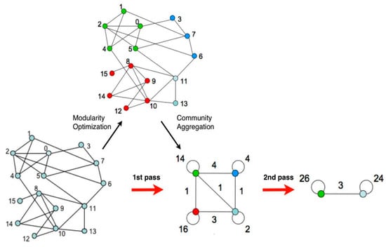 Likewise, as explained by Blondel et al. [46], in order to understand how an algorithm works, it should be divided into two processes. Each process has two additional steps. In one of these steps, modularity is optimized allowing for changes in communities according to their relevance. In the other step, the identified communities are aggregated in order to construct a network community [47,48]. These processes should be repeated alternately until modularity can no longer be increased [46].