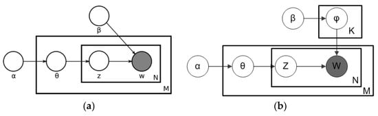 In Figure 2a, α is the parameter of the Dirichlet prior, β is the parameter that is representing the Dirichlet prior on the per-topic word distribution, is the topic distribution for document m, is the word distribution for topic k, and represents the topic for each word in the document. Finally, m represents the specific word. Figure 2b shows the plate notation for this model, where k denotes the number of topics, and are V dimensional vectors storing the parameters of the Dirichlet-distributed topic-word distributions [3,17].