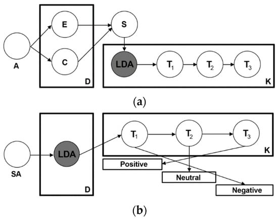 Sentiment analysis (SA) process from LDA to SA: (a) topics classification process; (b) sentiment analysis process applied to topics. Source: Saura and Bennett [3].
