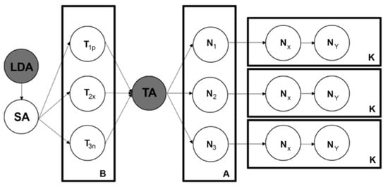 In Figure 3b, the neuron labeled SA is applied to the LDA model, and this, in turn, is applied to the topics. Therefore, each topic is divided into positive, negative or neutral sentiment.