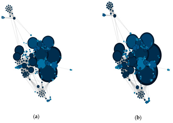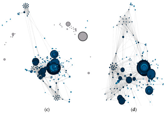In Figure 6c,d, the resolutions increased to 0.01 and 0.001, respectively, so as to better visualize the relationship among the communities. As can be seen in the graphs, in both cases, the importance of these communities was lower than in Figure 6a,b; therefore, their connections obtained a lower modularity. In Figure 6c, there are 519 communities linked to each other, while in Figure 6d, there are 1073 communities. However, this low modularity had no measurable significance to investigate the relationships among them.