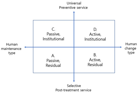 However, Mrazrek and Haggerty [25] classified social service into post-treatment service aimed at problem-solving and preventative service aimed at intervening in the cause of the problem. Furthermore, by combining these classifications, Kim et al. [26] presented an analysis framework of the social service model (Figure 1). As shown in Figure 1, social service is sub-divided as human maintenance service, and human change service classifications are placed on the horizontal axis and preventative (universal) and post-treatment (selective) service classifications are placed on the vertical axis.