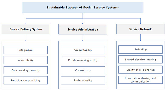 As shown in Figure 2, the research framework was designed for constructing sustainable success factors of the social service system for the elderly on the basis of previous studies on the component and success factors of the social service system. The main evaluation areas consisted of three categories.