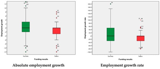 In terms of absolute employment growth, companies with successful crowdfunding showed a higher mean (0.91) than companies with failed crowdfunding (−1.52). Also, the employment growth rate was higher for companies with successful crowdfunding (24.760) than companies with failed crowdfunding (−7.940). In summary, these results show that companies with successful crowdfunding projects had an increase in employment, while failed companies had a decrease in employment.