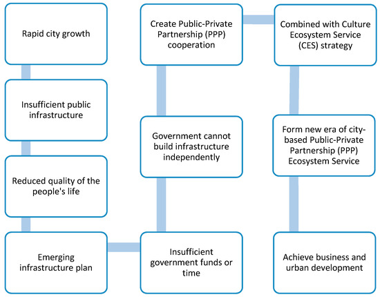 Due to the rapid growth of cities and the needs of quality public services with urban development, public-private-partnership (PPP) model has been increasingly used by government agencies to fund new infrastructure projects, which combines the power of private sectors to accelerate public infrastructure and services with mutual commitments. A success of PPP project is not considered merely on the design and construction but the operations management for public services. Shared values should be considered from the standpoints of the government, company, and the people. After completing the hardware facilities of the PPP project, the private enterprise must inject a new business philosophy in management, that is, implement the business strategy of the city-based cultural ecosystem service innovation (CESI) framework to realize the PPP model of business and city development (Figure 1).