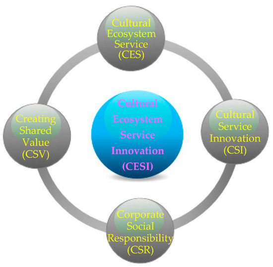 Cultural Ecosystem Service (CES) is a gateway to raise awareness for the importance of nature for urban life. It comprises the non-material benefits that people derive from nature, including entertainment, aesthetic enjoyment, physical and mental health benefits and spiritual experience. This helps to create a sense of place, promote social cohesion, and is vital to human health and well-being. Previous studies have proposed the importance of collaborative ecosystems and strategic innovation flows supporting the sustainable development for shared values [16,17]. Identification of an ecosystem helps to develop a strategic architecture that facilitates effective actions and leadership with strategic innovation [18]. The construction of culture as a class of ecosystem service presents a significant test of the holistic ambitions of an ecosystems approach to decision making [19]. At the same time, it also explores the balanced benefits of interpreting the ecosystem as the relevant behavior of cultural concerns and deeply understands how the concept of CES and innovation feedback flows produces complex operations and related results.