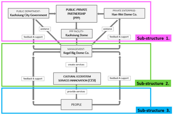 - Sub-structure 3: Kegel Big Dome Company applies the CESI framework to provide the overall cultural services of the general public. When people enjoy the facilities and activities, they will give relatively equal feedback to the operators so that the government departments, private enterprises, and the general public can benefit each other.