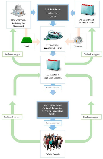In this section, we review the concept of PPP models and Cultural Ecosystem Service Innovation (CESI). Regarding a framework of evaluating how PPPs and private finance initiatives (PFIs) could contribute to sustainable development, previous studies have conducted comprehensive reviews and most of them are PPP models from the perspectives of architecture and engineering [6,7,8,9]. It is shown that more than 600 PPP papers published but lack of discussions related to follow-up management after the completion of PPP construction. However, the correct business management philosophy and strategy of the PPP model infrastructure accounts for a critical factor to the sustainable development of the PPP model. Therefore, from the perspective of CESI, it is necessary to analyze how the PPP model dome-type sports venues can more effectively integrate the interactive feedback between the government, the private sector, and the overall public and form a better management model to promote the efficiency of the PPP model.