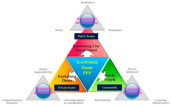 The government’s use of PPP model to encourage civil participation in sports and leisure public construction has three points: (1) sports facilities and equipment, (2) sports and leisure industry development, and (3) urban international development. The ultimate goal of the PPP in this case is to create a win-win-win situation for Kaohsiung City Government (public sector), Kaohsiung Dome (private enterprise), and the general public.