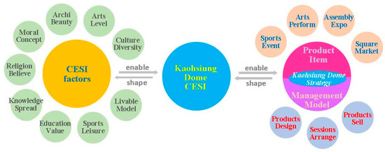 Figure 12 represents the CESI framework of Kaohsiung Dome and services. The services provided by this symbiotic relationship not only affect the survival and development of society and economy but also affect the generation and formation of culture and develop into different cultural types and models.