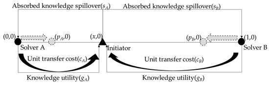 Based on above assumptions and notation, the solver’s game model for knowledge flow in scientific crowdsourcing is shown in Figure 1. In this model, solver A and solver B are located at (0,0) and (1,0) accordingly, and the initiator’s knowledge location is (x,0). The linear segment represents their knowledge space. During the scientific crowdsourcing knowledge flow process, the direction of knowledge utility flow is from solver to initiator, while the knowledge spill-over flow is in the reverse direction, which is from initiator to solver. The knowledge transfer cost, which is determined by unit transfer cost and the knowledge distance x, is also a key factor in the model. In reality, considering the solver’s continuous learning ability, which leads to shorter knowledge distance from the initiator, this paper also analysed the profit impact when solvers’ knowledge distance changed to new locations (pA,0) and (pB,0).