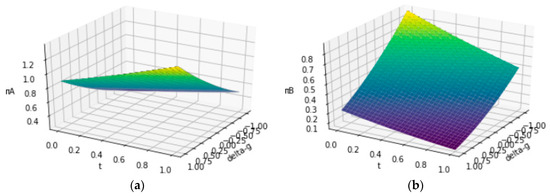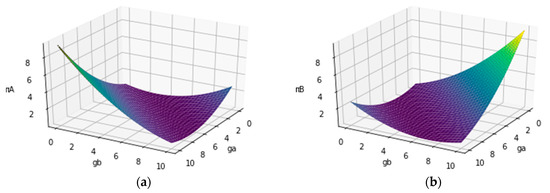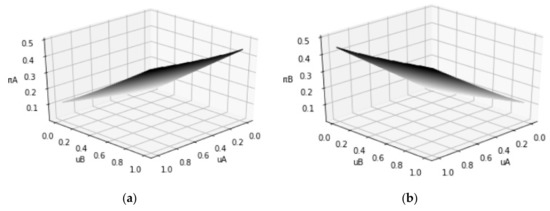 In scientific crowdsourcing activities, both solvers are in competition mode, and each solver’s target is to have higher expected payoff than the other. The profit gap ΔπA for solver A is calculated by πA − πB. Based on Equations (9) and (10), ΔπA is calculated as follows: