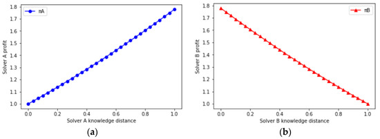 (a) solver-A’s profit versus knowledge utility; (b) solver-B’s profit versus knowledge utility.