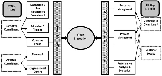 A successful implementation of open innovation can be achieved by implementing TQM first (Step 1), and then building on a quality assurance system such as ISO 9004:2018 (Step 2). The figure includes only those elements of ISO 9004:2018 that are not redundant with TQM, and none of the commitment dimensions that support the ISO 9004:2018 have any redundancy with TQM (the affective and normative commitment).