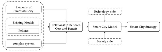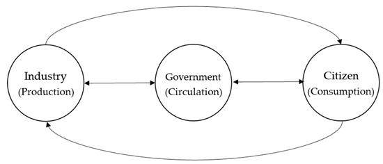 A city, a large human settlement, consists of three elements: people, business, and government organizations (Wikipedia). Nam and Pardo [13] analyzed various words that refer to a city, such as Digital city, and found that they resulted in three factors: technology, human, and institutions. Also, Yigitcanlar et al. [14,15] analyzed various definitions of Smart Cities and suggested ‘sustainability’, and ‘sustainable and knowledge-based development’ as keywords as comprehensive definitions. In addition, Hollands [16] has suggested that a holistic approach that facilitates the interaction between components of Smart Cities is required. Given the above, the essential elements of the city are defined as a space in which production and consumption circulated, and correspondingly, they present as industry, citizens, and government as representative elements as seen in Figure 1.