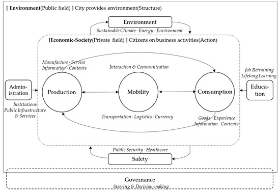 First of all, in the economic-society field, the production consists of industrial activities while consumption means citizens’ life. Then, they are connected by mobility, which can be redefined as the interaction between humans, space and time. In order for these three elements of economic-society to circulate and develop, the environment that a city offers should be provided. The environment consists of four elements—environment, institutions, education, and safety. The environment raises the issue of urban development while supporting sustainable economic and social development. Safety is an element provided by cities for the safe and healthy wellbeing of citizens. Education is also an important element of sustainable development connected with citizens’ job retraining and lifelong learning. Then an efficient administration must support the city as a system. Finally, the driving force that steers strategic directions is governance.