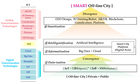 Accordingly, three tasks are required to realize the future Smart City: 1) data the city to enhance connectivity, 2) build an open platform on the Cloud, 3) activate data mash-ups. For system implementation, the four-level phase of Smart Transformation is the logical structure. This Process coincides with the stages to promote Smart City policies of major cities. The levels are about virtualizing reality through digital transformation, optimizing big data on the virtual world through AI, realizing through analog transformation. We proposed Datafication, Informatization, Intellectualization, and Smartification as four-level, which is identical to the human brain, with the perspective of structured model creation through the virtualization process and optimizing (smartizing) through predictions and customizations.