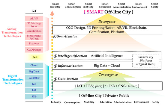 The 4-stage model of smart transformation presented by Lee et al. [7,38,39] is a meaningful attempt in terms of policy-making in that it has revealed the whole actualization process beginning with the digital twin concept where there is an exact 1 to 1 correspondence between the existing reality and the virtual. The virtual platform thus created is a result of the convergence of AI and Cloud that encompasses all the precious stages starting from data collection, culminating with the stage when the real is optimized through the technologies of analog transformation.