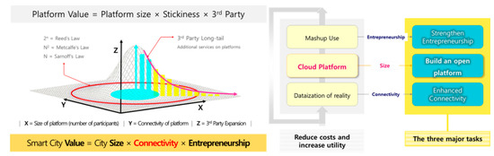 According to the UN (2018), 55% of the total population of the world live in urban areas and it is expected to increase to 68% by 2050 [1]. As benefits that city offers increase, the urban population is growing along with it. Traffic, environmental problems, and crimes are naturally increasing as well. Around 2010 major countries around the world, have started to build ‘smart’ cities in order to lower costs and improve the services offered. There are, however, several different perspectives on how ‘costs’ and ‘benefits’ should be defined. From a cost perspective, the recognition that a Smart City should be considered a ‘platform’ and that led to attempts to design cities with that in mind were made. Hwang [2] has offered the concept of ‘city as a platform’. Grech [3] suggested that if a city is seen as a platform, it would be easier to build the service relationship between the city and its citizens. Barcelona [4] utilized a concept that is a functional urban operating system (OS), and called it ‘city anatomy’, and constructed named ‘city protocols’. Cohen [5], and Eggers and Skowron [6], on the other hand, have seen a city, not as infrastructure but data, and offered the direction of the Smart City evolution model as the connection between the city and its citizens where the city is not seen a physical space but the center of citizen participation—which is the objectives of a platform. Smart City as a platform, in short, evolves from a data platform that is a tool for lowering costs to a citizen-centered that is value-oriented—where values are seen as ultimate objectives.