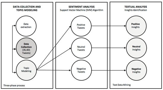 The methodology used in this study was a three-phase process []. First, LDA with the Python model was used as a state-of-the-art thematic modeling tool to determine the topics in the database []. The data were collected by extracting tweets with the hashtag #Millennials, #Millennial and #MillennialGeneration on Twitter (n = 35,401) []. Secondly, sentiment analysis was performed with a SVM algorithm which was also used with machine learning in Python [] that divided the identified topics into three sentiments []. Thirdly, textual analysis was further used with data text mining techniques, including the qualitative analysis software NVivo []. In order to summarize the methodology, Figure 1 shows the three-phase process used [].
