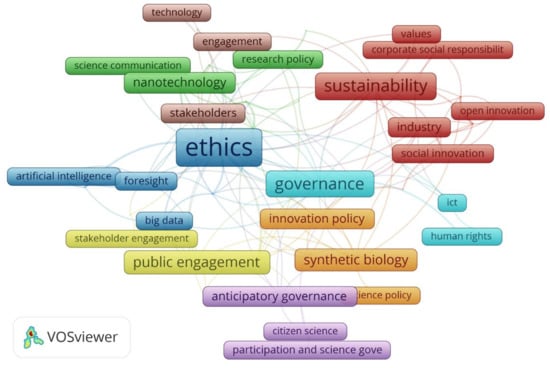 Visualization of the network of keywords in RRI-related literature (source: own elaboration on the basis of Scopus data with use of VOSviewer software (ver. 1.6.14, Centre for Science and Technology Studies (CWTS) of Leiden University, Netherlands, 2020)).