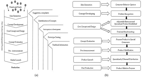 Differences in the stages of new product development with active problems and with inactive issues. (a) The stages of product development with an active problem perspective []; (b) The stages of product development with an inactive problem perspective.