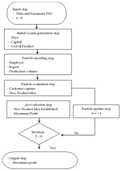 Here, the application of PSO employed the capital of SMEs, which was called the swarm, and the idea realization through the utilization of capital was called a particle. Each particle moves at a speed that is adapted from the searching area and stored as the best achievement position. The steps of optimization when using PSO were: (1) Determine the initial parameter u, α, a d ρ, where iteration was set at 1; (2) select the random sample X1, …, XN from a certain probability distribution function f(-;u) and the selected sample (1 − ρ) from the ranked performance; (3) use the same samples to adjust the parameter values; (4) apply the equation ṽt = αwt + (1 − α) ṽt-1 to run the vector ṽt = u. When going back to Step 2 with new parameter value, it was determined that the iterations = it + 1; (5) analysis is stopped when the stopping criteria are fulfilled.