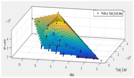 Active SMEs initially had a constant line forming saturation patterns, which indicates that the cost and idea realization strongly determine the obtained profit in new product development within the inactive problem perspective. However, at specific points, the higher cost of idea realization was found to decrease profit. The correlation between these two variables was rather linear. However, it was found that more ideas trigger higher costs, as the expenses to pay for expert workers and work duration increase (Figure 3).