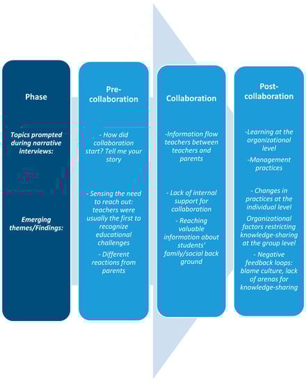 An important way to understand human experiences and meaning-making is by listening to their stories [,]. Usually, participants narrate experiences that are exceptional or deviating from the normal [,]. Whenever participants are asked to tell stories about their collaborative practices, they are usually driven by memories of either exceptionally successful or unsuccessful collaborative relationships. Hence, narrative analysis of detailed stories including interactions, structural factors, context, characters, and turning points that have been constructed by the narrators can result in a better understanding of the parent–teacher collaboration. The narrative methods have been applied to grasp the temporal and experiential dimensions of complex change in different organizational settings []. This is a small qualitative study and, therefore, does not provide the space for statistical generalizations. This may be seen as a limitation of this study.