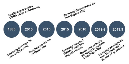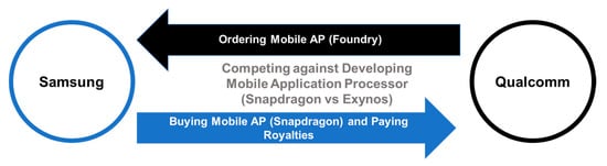 Qualcomm has the ability to design SoC chips. It also still has a competitive edge in the mobile AP market, and its design capabilities will keep it competitive. Samsung, on the other hand, can design SoC chips and has the ability to manufacture them. Qualcomm faces the overheating issue of their chip, Snapdragon 820, and challenges from the competitors. To get out of this unfavorable situation in which Qualcomm faces, the firm has to keep up the coopetition with competitors. At present, Qualcomm still coopete with competitors, as in the case of Apple’s decision to receive 5 G modem chips from Qualcomm. Apple decided to yield in the patent war with Qualcomm. Qualcomm is still maintaining its top position in the semiconductor market. With the advent of the 5 G semiconductor era, Qualcomm’s market dominance persists, and Qualcomm’s share stood at 87.9 percent as of 2019 [52]. Qualcomm still has Samsung as its customer, even though Samsung has emerged as a competitor. These respective strategic differences show that while Qualcomm continues to coexist with Samsung, the relationship of global cooperation entails inherent risks. Since Qualcomm is Samsung’s largest supplier of components, the two companies are basically collaborative in that they maintain a cooperative relationship in the mobile AP market. But at the same time, Samsung is inevitably competing with Qualcomm by having the ability to produce mobile APs in-house. As a result, a global firm does not span only one industry but changes into a complex structure. In the midst of this process, a firm develops into having complex roles, such as being a competitor and a customer. Figure 3 summarizes the history of coopetition process of both firms.