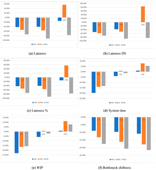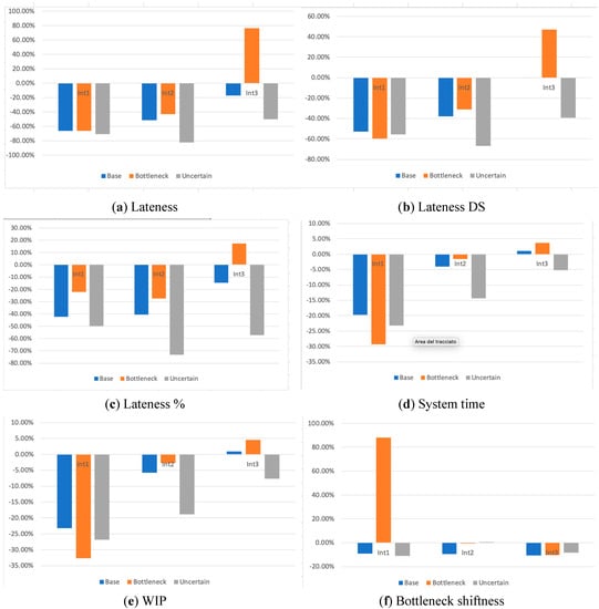 Simulation results with uncertain and bottleneck. (a): Lateness; (b): Standard Deviation of the Lateness; (c): percentage of parts in lateness; (d): throughput time of the manufacturing system; (e): Work In Process; (f): Bottleneck shiftness.