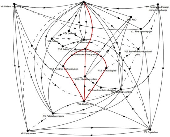 At the second stage, the study of the properties of a complex system of cognitive model of balanced development of regional higher education systems, meeting the needs of the region has been compiled. This stage involves: a study of the sustainability of the model of regional higher education systems development to disturbances, the structural stability of the model, ways, cycles sensitivity, complexity, connectedness, dynamics and others [50]. This stage of the study allows us to reveal in detail the nature of the connections between vertices and factors and to accumulate knowledge about the state of congruence and the relationship of the regional higher education system and socio-economic system.
