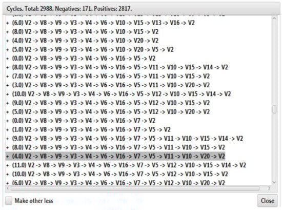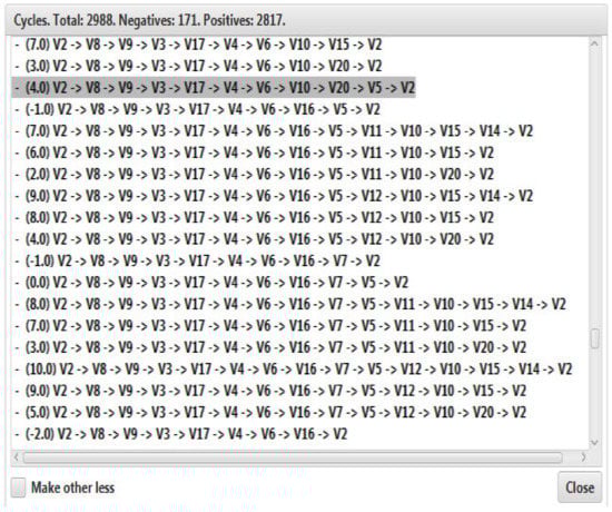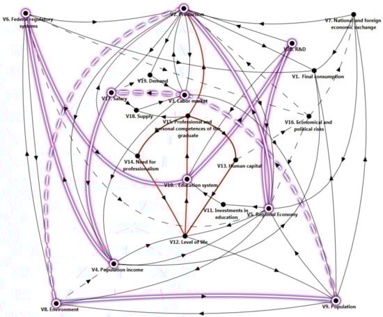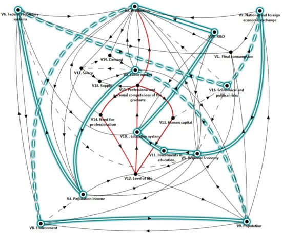 The next stage is devoted to the study of the properties of a complex system of a cognitive model for the balanced development of regional higher education systems in Russian regions, taking into account the needs of the region. Figure 2, Figure 3, Figure 4 and Figure 5 show particular cases of a computational experiment aimed at studying the paths and cycles of the graph of the cognitive model (G) of the relationship between the regional system and the higher education system, taking into account the needs of the region and external factors, such as federal regulatory systems, economical and political risks, and national and foreign economic exchange.