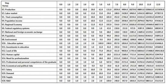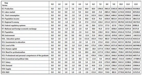 A cognitive model (G) of the relationship between the regional system and the higher education system, taking into account the needs of the region, is presented in the Figure 1. It is intended to formalize the interactions of a semi-structured regional economic system. Vertices and arcs of the relationship between the regional system and the higher education system are clearly reflected. The arc-connected vertices show nonzero relationship among the regional system and the higher education system, taking into account the needs of the region. Using such cognitive map, it is possible to analyze the functioning of the regional economic system, and according to its results, it is possible to identify which vertices interactions have the strongest positive or negative impact on the indicators and relations of regional system actors. According to these results, it is possible to predict the processes’ efficiency within these systems, model the behavior of the system in response to disturbing influences, and trace the effectiveness of the actors’ interaction and institutional management of this system.