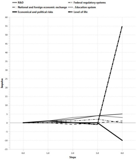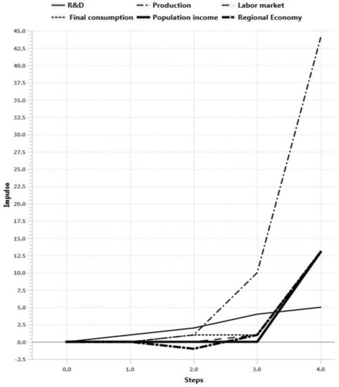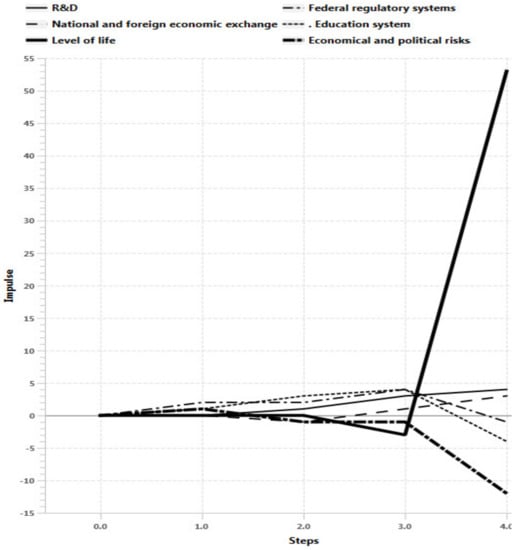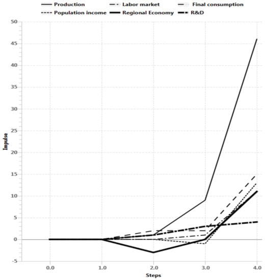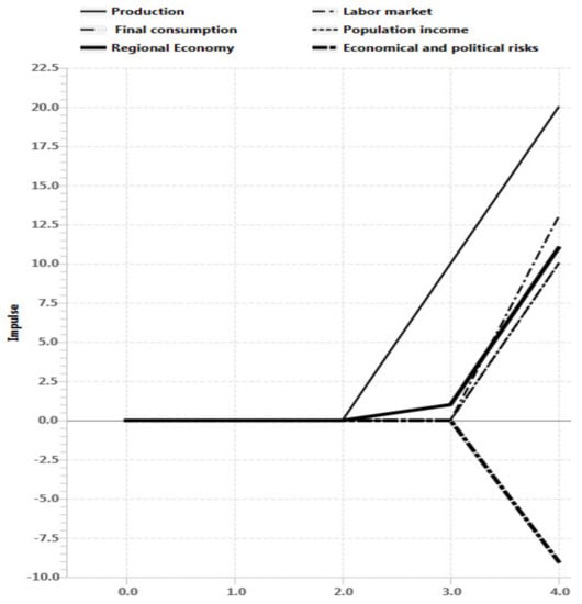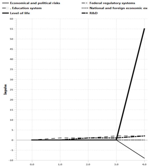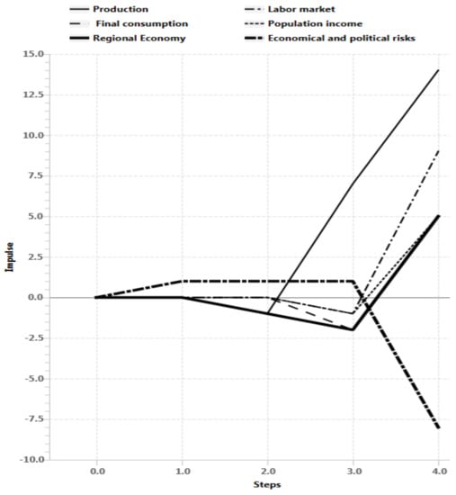Scenario 4 results. Improving the conditions of higher education and economical and political risks increasing, while federal regulatory systems and R&D reacting shows the sustainable development of the regional system in long term prospective. There is a stabilization phase in the second step (Figure 17), which leads to rapid growth of production indicators, labor market, final consumption, population income, finance and the economy of the region as a whole after n > 3. At the same time analysis of impulse processes of graph (Figure 18) also shows sustainable situation of the regional with R&D development, including federal regulatory systems growth and economical and political risks decrease in long term prospective.
