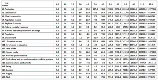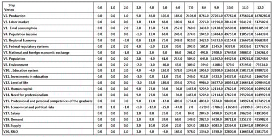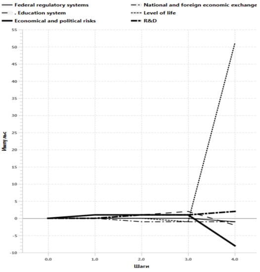 To construct the selected scenario (Figure 16), let us suppose that there are transformations beginning in the education system that meet the requirements of modern society; managing influence q10 = + 1., but at the same time political and economic risks q16 = + 1 are increasing, which are opposed by the actions of federal regulatory systems q6 = + 1 and R&D increasing q20 =+1; action vector Q1 = {q1 = 0; 0; … q6 = + 3; 0; … q10 = + 1; 0; …; q16 = + 1; 0; …; q20 =+1}.