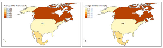 Spatial distribution of youth GMO awareness and expectations within NAFTA.