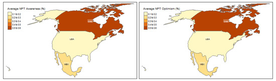 In the present analysis, the dependent variables are adolescent students’ levels of awareness and expectations about GMOs and NPT in North America. Figure 1 and Figure 2 summarize the spatial distributions of these variables within NAFTA: