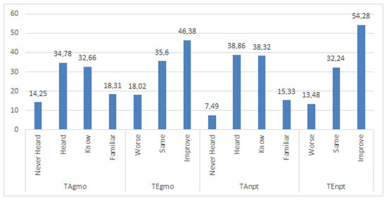 Table A2, and Figure 3 summarize the unconditional percent relative frequency distributions of youth awareness and expectations about GMOs and NPT within the North American free trade bloc. With regard to GMO awareness (TAgmo), we note that the majority of youth (34.78%) report to having heard about GMOs but are unable to explain, followed by 32.66% that report knowing about it and able to provide general explanations, then 18.31% that report being familiar with GMOs and able to provide detailed explanations, and finally, 14.25% that report having never heard about GMOs. Concerning youth GMO expectations for the next 20 years (TEgmo), we note that the majority of youth respondents are optimistic (46.38%), and believe it will improve over time, followed by 35.6% that believe it will stay the same, and finally, 18.02% that feel pessimistic, believing it will get worse over the next 20 years.