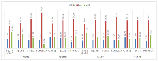 Focusing on GMO awareness (TAgmo), we note that except among the youth that report to being familiar with GMOs and able to provide detailed explanations, where the relative frequency of youth from USA (17.89%) is higher than that of Mexico (8.72%) and both lower than that of Canada (74.06%), across all levels of GMO awareness, the relative frequency of youth is the highest in Canada, followed by Mexico, and finally, the USA. With regard to GMO expectations (TEgmo), we note that overall, across all levels of expectations, the relative frequency of youth is the highest in Canada, followed by Mexico, then the USA.