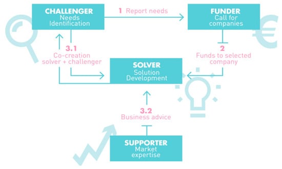 Although it has been shown in many cases that open innovation is key for companies’ economic performance, the current literature does not provide a clear picture of the most important success factors of open innovation [5,6]. Additionally, not much attention has been paid to the success of open innovation from the perspective of various actors from different stakeholder groups who have participated in the innovation process [7,8,9]. Thus, there is a clear need for future research into interactive collaboration of ecosystems as spaces for innovation co-creation [10]. This study aims to increase understanding of the success factors related to demand-driven open innovation in the ecosystems, which includes actors from companies, hospitals and policy-makers. The analysis of the success factors is done from a policy perspective, which is not covered that much in the current open innovation literature. The paper is based on a longitudinal case study in which the data were collected from multiple stakeholders in the three open innovation ecosystems. The collected data include several surveys, interviews and focus group discussions that aimed to understand the success of the demand-driven open innovation process compared to the respondents’ previous situations, in which they used a more closed technology push approach. In our case study, there are four key players. We have a Challenger that identifies needs (challenges) proposed by healthcare professionals. The Funder is a local entity that manages public funding and regional innovation activities, i.e., launching an innovation call for competition. The Solver is a private company that co-develops the best innovation ideas together with the Challenger. The Supporter is an intermediate organisation that delivers business support to the Solver and mobilises the local innovation ecosystem.