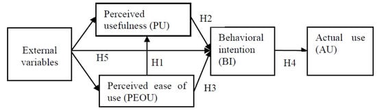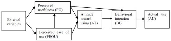 Figure 1 shows the original TAM, which states that a user’s perception of usefulness and ease of use determines their attitude toward using (AT) the system, where further behavioral intention to use (BI) is determined by this attitude. According to the TAM, behavioral intention determines actual system use (AU). TAM proposes a direct relationship between perceived usefulness and behavioral intention to use.