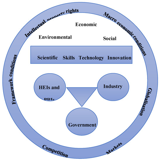 The triple helix model considers the university academy as a primary participant in any typical innovation system [20]. The THM assumes that academy bodies, the government and the private and industrial sectors may play a significant role in the establishment of innovation policies, with strong economic growth and social transformation effects. However, the implementation of the THM requires dramatic HEIs transformation, from just being a teaching institution to becoming a teaching and research institution, along with novel legislative and specific bylaws to regulate the relationship of university, industry, or private sector and government.