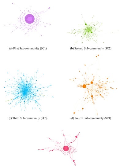 Additional analysis was undertaken to examine the network topologies of the five largest communities that were identified in the dataset. These are presented in Figure 2, where each sub-community is denoted by SC1 to SC5 by degree of magnitude, with 1 being the largest sub-community.