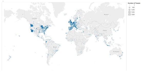 Spatial analysis was performed on the subsample of tweets for which the geographical location was available. Even though this subset only represents one percent of the full sample, it is still large enough (27,321 tweets) to provide reasonably generalizable results. Over 137 countries and 3972 places (cities, towns and other granular geo-locations) can be identified in the overall dataset, representing a minimum number. Table 4 provides a list of the 20 countries with the largest volume of tweets, while Table 5 provides an overview of the number of countries and places detected in the five largest sub-communities. The United States (US) was found to be the most active country with 48.66% of the total tweets (17,402 tweets), followed by the UK (11.04%), France (7.09%), and Spain (6.28%). Although the results of this analysis may be partly driven by the fact that our dataset only includes English language tweets or by the population distribution across different countries, it is worth noting that the most active countries in terms of volume of tweets are also the ones with the largest market share in terms of crowdfunding volume [87].