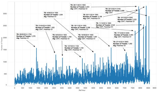 - Healy, P.; Hunt, G.; Kilroy, S.; Lynn, T.; Morrison, J.P.; Venkatagiri, S. Evaluation of peak detection algorithms for social media event detection. In Proceedings of the 2015 10th International Workshop on Semantic and Social Media Adaptation and Personalization (SMAP), Trento, Italy, 5–6 November 2015. [Google Scholar]