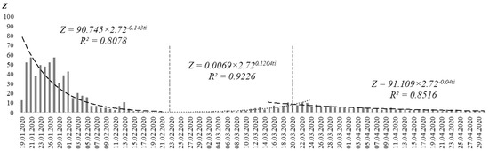 To assess the dynamics of the indicator Z presented in Figure 1, we took the values of the variation series for the 19.01.2020–30.04.2020 period with the extremes being excluded (nine determined by the Dixon criterion). The dynamics of the Z indicator demonstrates three stages of its development. Statistically, the significance of the differences in the regularities of the Z indicator change at these three stages was confirmed by the Chow’s test. Application of this test proved the presence of two structural shifts in the dynamics of the indicator: (1) in the 21.02.2020–24.02.2020 period; (2) in the 19.03.2020–21.03.2020 period. Checking model residue with F-statistics showed that F1 > Ftabl (10.37 > 4.12), F2 > Ftabl (9.84 > 4.03), with F1 being the empirical value of statistics calculated on the basis of the difference between the sum of deviation squares of the model built on the intervals [t0; t2] and the models built on the intervals [t0; t1], [t1; t2]; with F2 being the empirical value of statistics calculated on the basis of the difference between the sum of deviation squares of the model built on the intervals [t1; t3] and the models built on the intervals [t1; t2], [t2; t3]; and with Ftabl being tabular Chow statistics with p = 0.05; t0 = 19.01.2020, t1 = 22.02.2020, t2 = 20.03.2020, and t3 = 30.04.2020.