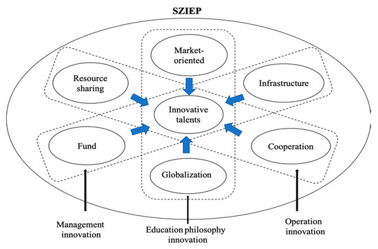 Figure 2 shows an internal open innovation ecosystem of SZIEP. Inside the SZIEP, the educational institutions have a high degree of collaboration and resource sharing. On one hand, by emphasizing efficient and intensive land utilization, all of them can share public service areas, service facilities, student residences, restaurants, and sports venues provided by the SZIEP. Non-profit educational institutions including the Institute of Cultural and Creative Industry, Asia Europe Business School, Joint Translational Science and Technology Research Institute, and Shanghai International College even can share teacher resources and scientific research resources. It means students can choose courses across the school, and teachers are allowed to teach in different schools. Resource sharing is also reflected in the collaboration between non-profit and for-profit educational institutions. As a for-profit educational institution, Shanghai Zizhu International Education College can carry out various types of undergraduate-level international cooperation courses and on-the-job training programs with other institutions.
