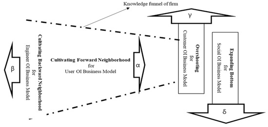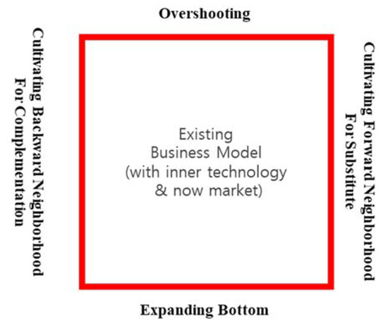 We innovated the modern business model using a rectangular compass that has four aspects: over-shooting of the modern business model, expanding the bottom of the modern business model, cultivating the forward neighborhood of the modern business model, and cultivating the backward neighborhood of the modern business model. We designed the concept model as shown in Figure 1. Furthermore, if the rectangular compass is applied to the open innovation knowledge funnel, the four rectangular aspects can be matched to four agents who develop business models at the four locations of the open innovation knowledge funnel, as in Figure 2 [24].
